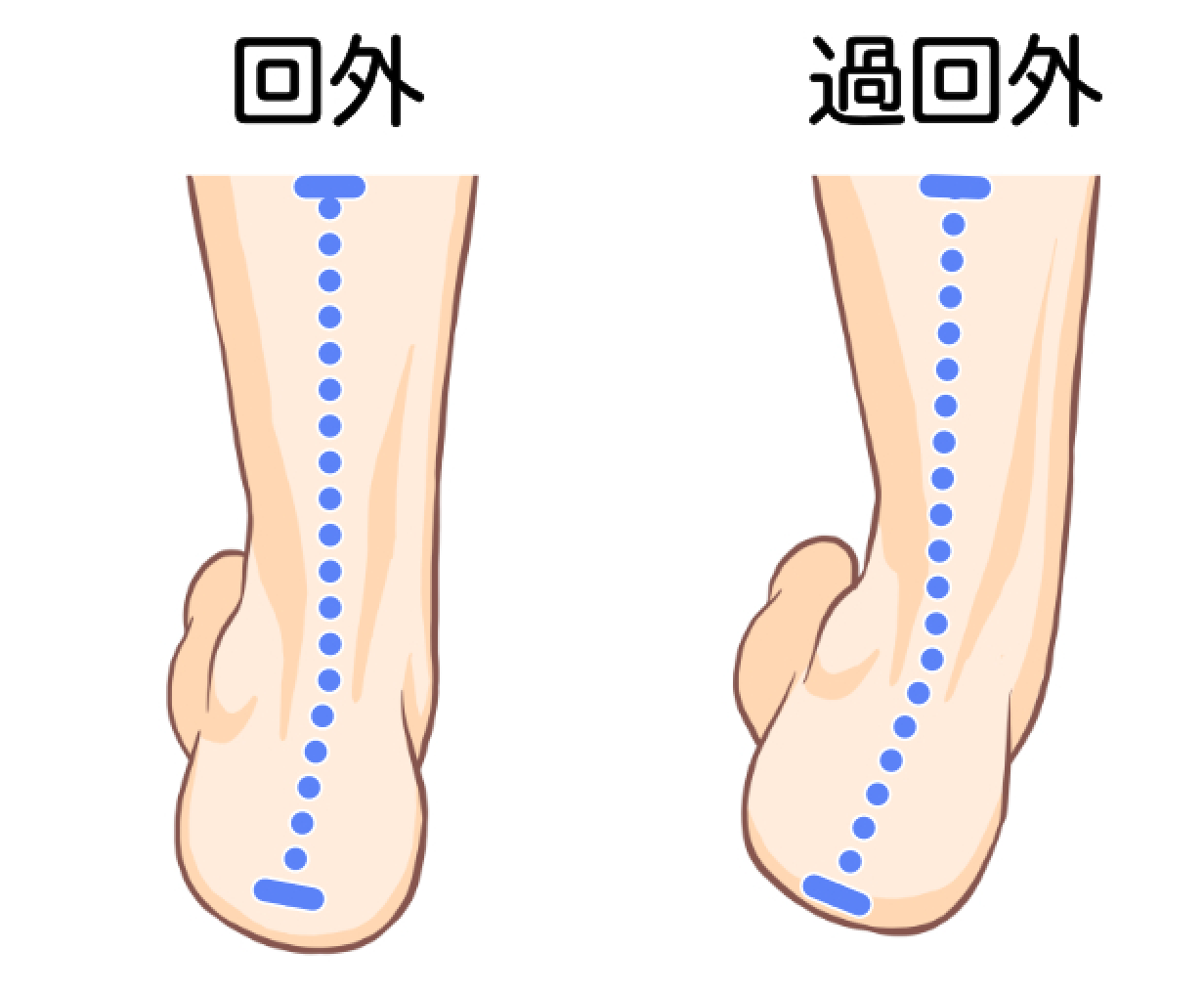 立った時に後ろから見ると、かかとが外に倒れていて、親指(母趾)が見えやすいのが特徴です。