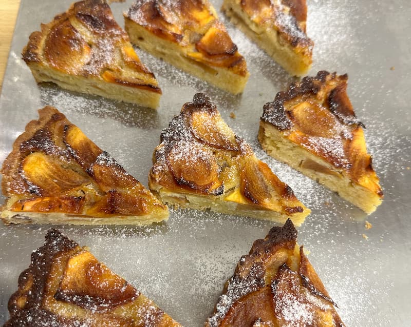 フルーツタルトの多くは、焼いたタルト台の上に生のカットしたフルーツをのせるのですが、今回は日持ちしやすくするためにタルトの生地に混ぜ込んで一緒に焼くことにしました。